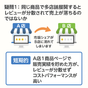 疑問1:同じ商品で多店舗展開するとレビューが分散されて売上が落ちるのではないか